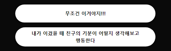 여러분들은 친구와 내기를 할 때 어떤 마음 가짐으로 하시나요? <내기는 질 수 없지! 무조건 이겨야해 VS 내가 이겼을 때 친구의 기분이 어떨지 생각하고 행동한다> 이 답변 또한 큰 차이가 날 것으로 예상됩니다.