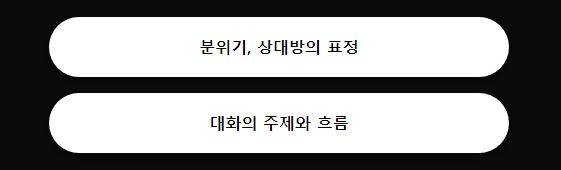 상대방과 대화할 때 어떤 부분이 더 신경 쓰이시나요? 대화를 함께하는 상대방의 분위기나 표정이 더 신경 쓰이시나요? 혹은 대화의 주제와 흐름이 더 신경 쓰이시나요? 조금이라도 더 집중해서 살피는 부분이 있으시다면 망설이지 마시고 선택해 주시기 바랍니다!