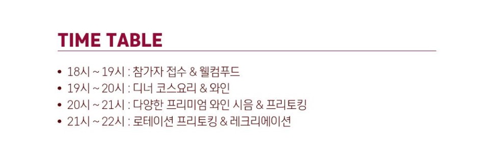 이번 와인파티 일정표에 대해서 알려드리자면, 참가자 접수는 오후 6시부터 가능하며 7시 정각에 파티가 시작될 예정이오니, 되도록이면 10~20분 전에 도착하셔서 참가자분들과 가볍게 인사하는 시간을 가져보시길 바랍니다. 이후에는 디너 코스요리와 와인을 즐기시면서 참가자분들과 프리토킹을 하실 수 있으며, 다양한 프리미엄 레크리에이션을 통해 좀 더 자연스러운 분위기를 형성해 드릴 예정입니다.