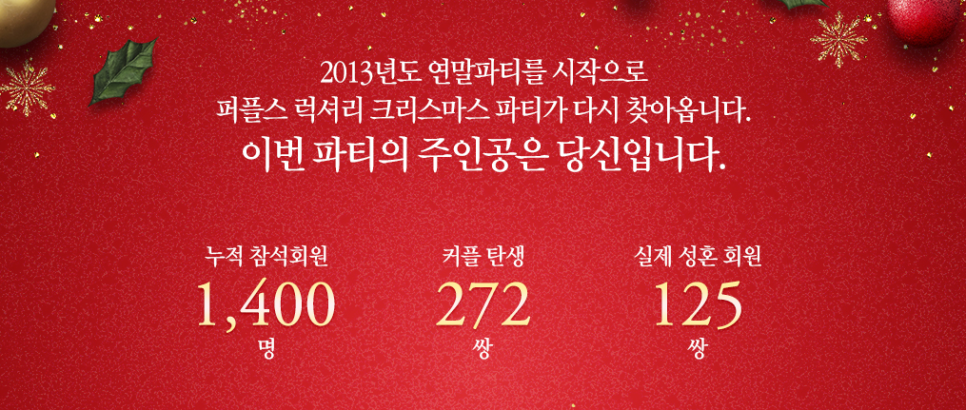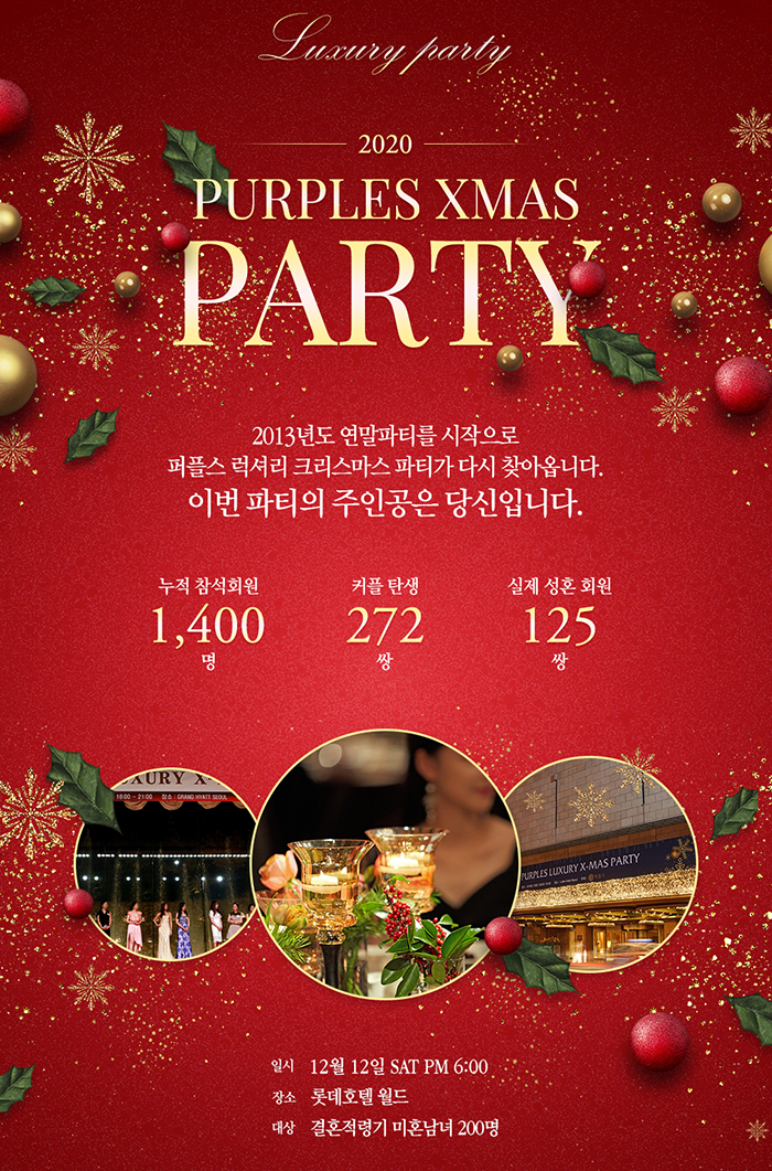 2013년도 라움 아트센터를 시작으로 2014, 2015, 2016년 그랜드 하얏트 서울, 2017, 2018, 2019년 롯데호텔에서 개최되었던 퍼플스 럭셔리 크리스마스 호텔 와인파티가 이번 2020년도에도 어김없이 찾아왔습니다. 오늘 이 시간에는 미혼남녀 200명이 참석하며 매년 수많은 성혼 커플을 탄생시키고 있는 '퍼플스 럭셔리 크리스마스 파티'에 대해 자세히 알아보도록 하겠습니다.
