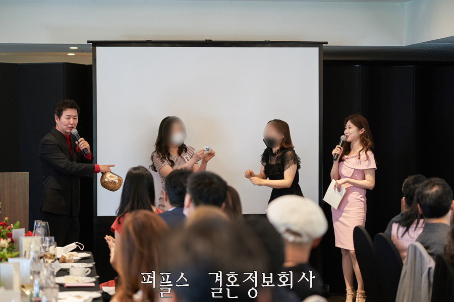 자유롭게 이성과 대화할 수 있는 시간인 로테이션 프리토킹이 종료된 후 재혼사이트 퍼플스가 준비한 마지막 프로그램! 바로 레크리에이션이 진행되었습니다. 각 테이블 당 두 커플씩 짝을 지어 상대방의 관심사와 성향을 알아볼 수 있는 이구동성 게임이 진행되었으며 가장 좋은 케미를 보여준 커플에게 퍼플스가 준비한 상품을 제공하였습니다.