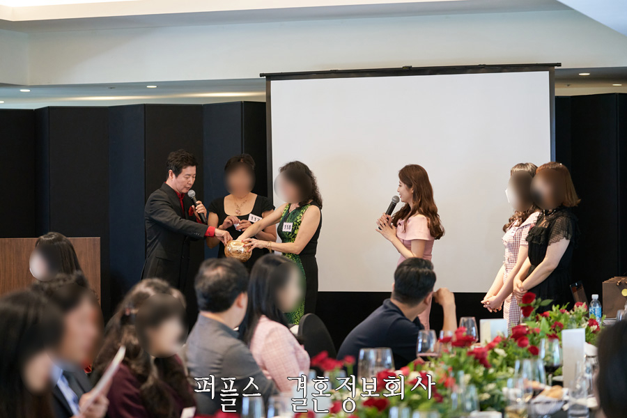 파티 분위기가 무르익을 때쯤 재혼사이트 퍼플스가 준비한 럭키드로우 시간이 이어졌습니다. 럭키드로우는 회원님들의 명찰 번호를 통해 추첨을 진행하였으며 MC 김덕현 님의 센스 있는 진행으로, 회원님들이 직접 럭키드로우를 추첨하였습니다.