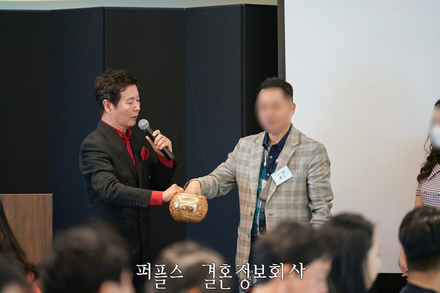 파티 분위기가 무르익을 때쯤 재혼사이트 퍼플스가 준비한 럭키드로우 시간이 이어졌습니다. 럭키드로우는 회원님들의 명찰 번호를 통해 추첨을 진행하였으며 MC 김덕현 님의 센스 있는 진행으로, 회원님들이 직접 럭키드로우를 추첨하였습니다.