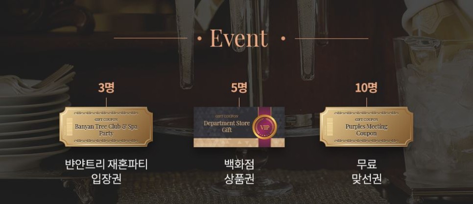 이번 해, 반얀트리 호텔 재혼미팅파티는코로나 19 바이러스로 인해 파티 개최가 불가능하였을 수도 있었는데요. 하지만 재혼전문결혼정보회사 퍼플스 회원님들의 적극적인 참여와 관심으로 3년 연속 개최할 수 있었습니다. 따라서 파티를 개최할 수 있도록 성원해 주신 회원님들에게 감사하는 마음을 표현하고자 다가오는 2020 재혼파티를 경험할 수 있는 무료 참가권을 추첨을 통해 3명에게 증정할 예정입니다. 이 밖에도 백화점 상품권 (5명), 무료 맞선권 (10명)이 증정되오니 30대재혼, 40대재혼 50대 재혼을 희망하고 계시는 돌싱 분들의 많은 참여 부탁드립니다.