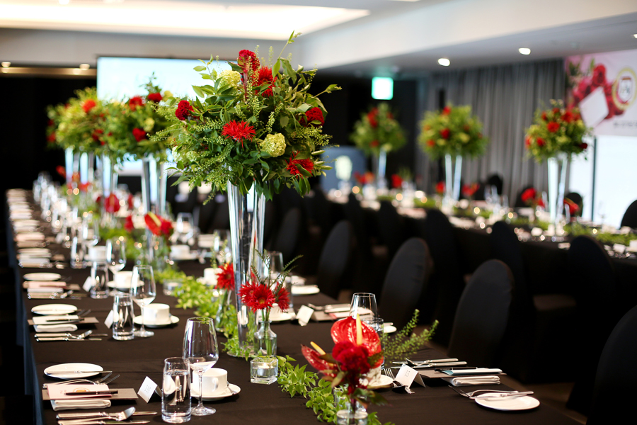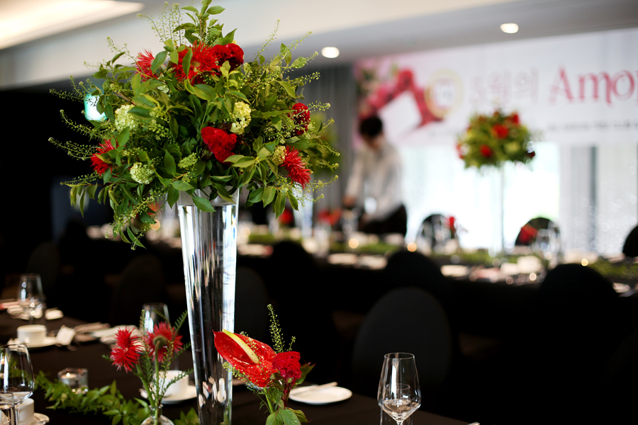 오늘의 운명적 만남이 이뤄질 파티장입니다. 지난번과 마찬가지로 일자 테이블에 센터피스로 화려함을 더했는데요. 특히, 이번 파티에는 <Amor Fati> 콘셉트에 맞게 강렬한 레드로 포인트를 주어 더욱 생기 있는 파티 분위기를 만들려고 노력을 하였습니다.