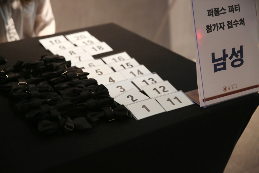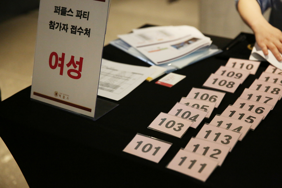 오늘 참석한 회원들은 많은 이성과 대화를 하게 되는데요. 이때 서로를 더욱 잘 기억할 수 있도록 이름 대신 번호표 명찰을 부착하고 파티에 임하게 됩니다.