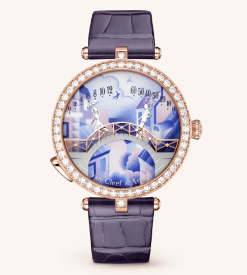 반클리프와 아펠의 러브 스토리에서 시작된 '퐁 데 자모르 주 워치'는 남자와 여자가 퐁 데 자르 다리에서 1분간 세상에서 가장 아름다운 키스를 나눈다는 이야기를 담고 있습니다. 시계의 우산을 든 여성과 꽃을 든 남성이 각각 시간과 분을 알리며 양 끝에서 중앙으로 이동하는 신선하고 아름다운 시계입니다.