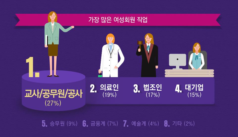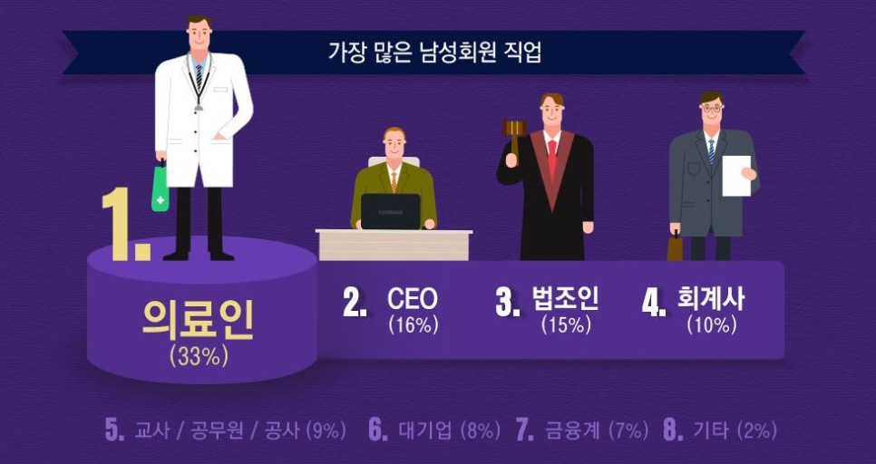 결혼정보회사 퍼플스에 활동하고 있는 남성 회원 중 가장 많은 비율을 차지하는 직군은 의료계 종사자와 사업가, 법조인이며 여성 회원으로는 교사/공무원, 의료인, 법조인 등이 높은 비율을 차지하고 있습니다. 이처럼 퍼플스에는 앞서 보았던 쥐띠 결혼 선호 직군에 속하는 직업을 가진 남녀 회원 비율이 높으며 미혼인 30대전문직은 미래의 안정적인 결혼생활을 위해 투자를 아끼지 않는다는 것을 알 수 있습니다.