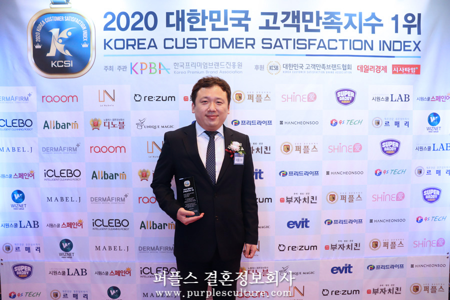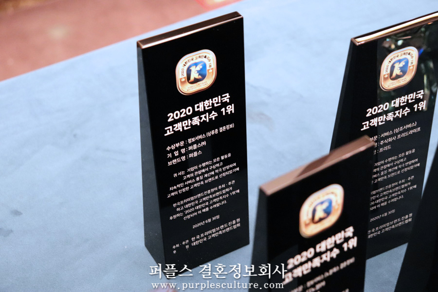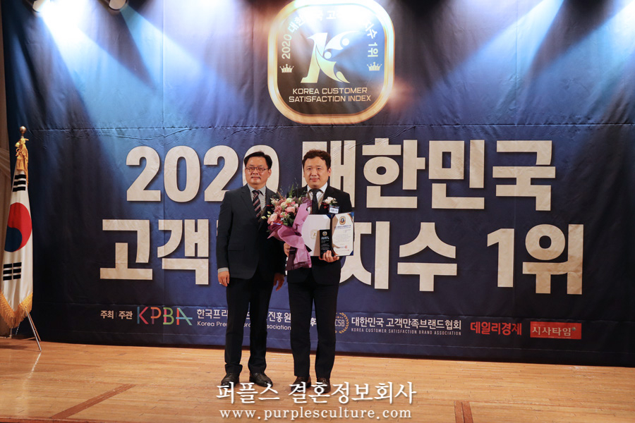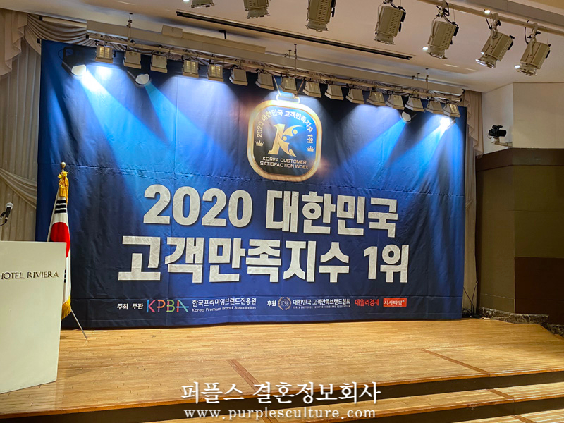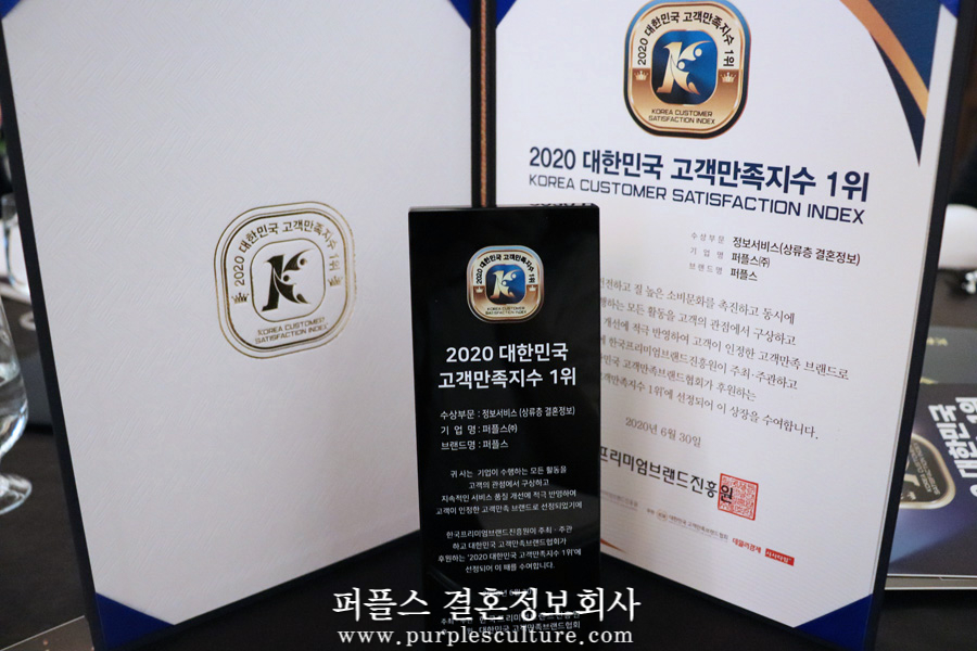 직장인미팅을 주선하고 있는 결혼정보회사 퍼플스가 '2020 대한민국 고객만족지수 1위' 정보 서비스(결혼 정보) 부문에서 2년 연속 수상하는 영예를 안게 되었습니다. 고객이 인정한 브랜드를 선정하여 수상하는 자리이기에 더욱 의미 있었던 '2020 대한민국 고객만족지수 1위' 시상식 현장을 지금 전해드리도록 하겠습니다.