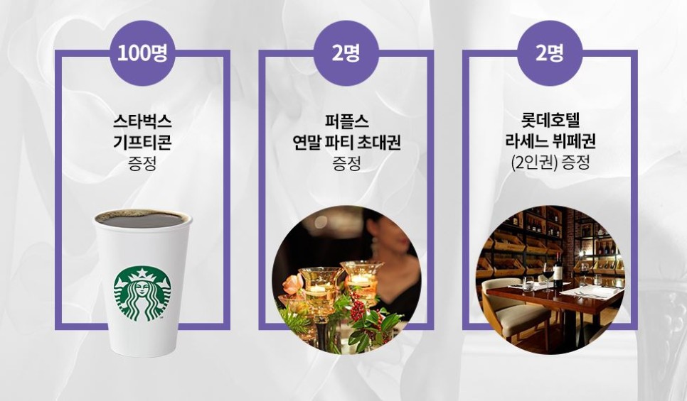 경품에 대해서 설명드리면, 이벤트를 완료하신 분들 중 100명에게는 스타벅스 기프티콘, 2명에게는 오는 12월에 개최되는 청담동결혼정보회사 퍼플스 연말 파티 초대권, 1명에게는 롯데호텔 라세느 뷔페권(2인권)이 증정될 예정입니다. 평소 궁금했던 사항에 대해서 테스트해보고 다양한 경품도 획득하는 행운을 누려보시길 바랍니다.