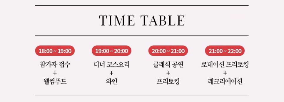 '겨울 로맨스' 미팅파티의 상세 일정으로는 6시부터 참가자 접수와 함께 웰컴 푸드가 제공되며 참석자들과 가볍게 인사할 수 있는 시간이 주어집니다. 7시부터는 특급호텔에서 제공하는 디너 코스요리와 함께 와인을 즐겨주시면서 옆자리에 앉은 이성과 대화를 이어나가면 되는데요. 이후 클래식 공연과 로테이션 프리토킹, 레크리에이션이 진행되어 첫 만남의 어색함이 느껴지지 않도록 분위기를 조성할 예정입니다.