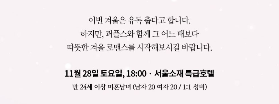 이번에 진행하는 '겨울 로맨스' 파티는 1:1 만남이 어색하신 분, 여럿이 모여 자연스러운 분위기에서 인연을 만나 실수 있는 파티입니다. 그동안 맞선, 소개팅의 실패로 색다른 만남이 필요하신 분들이라면 청담동결혼정보회사 퍼플스가 준비한 파티의 기회 놓치지 마시고 바로 신청해 주시길 바랍니다.