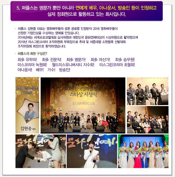 세계적으로 인정받는 청담동며느리룩 대표 명품 브랜드 '베르사체'와 상류층결혼정보회사 퍼플스의 공통점을 찾아본다면 유명 영화배우와 방송인의 선택을 받은 브랜드라는 것입니다. 현재 다양한 결혼정보회사가 운영되고 있지만 유명인의 결혼을 진행한 회사는 많지 않은 것이 현실입니다. 반면 퍼플스에는 연예계 배우, 아나운서, 방송인 등이 정회원으로 활동하고 있으며 직접 그들의 결혼을 진행하기도 하였습니다. 이들의 선택은 상류층결혼정보회사 퍼플스의 품격을 대변해 준다는 것을 알 수 있습니다.