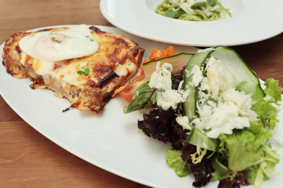 믹스 샐러드, 감자튀김, 계란 프라이를 곁드린 프랑스식 햄치즈 샌드위치입니다.
