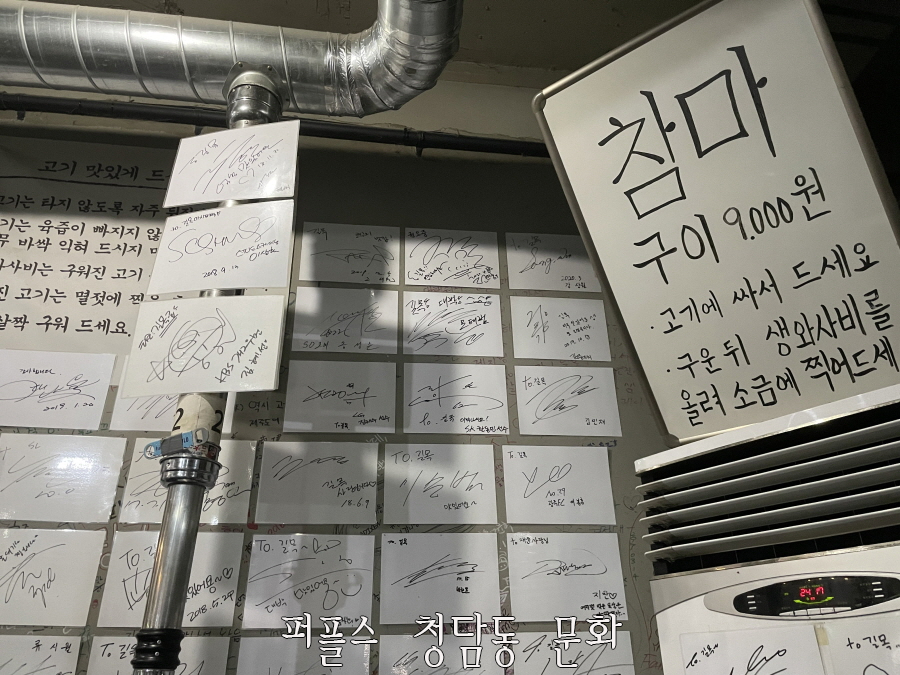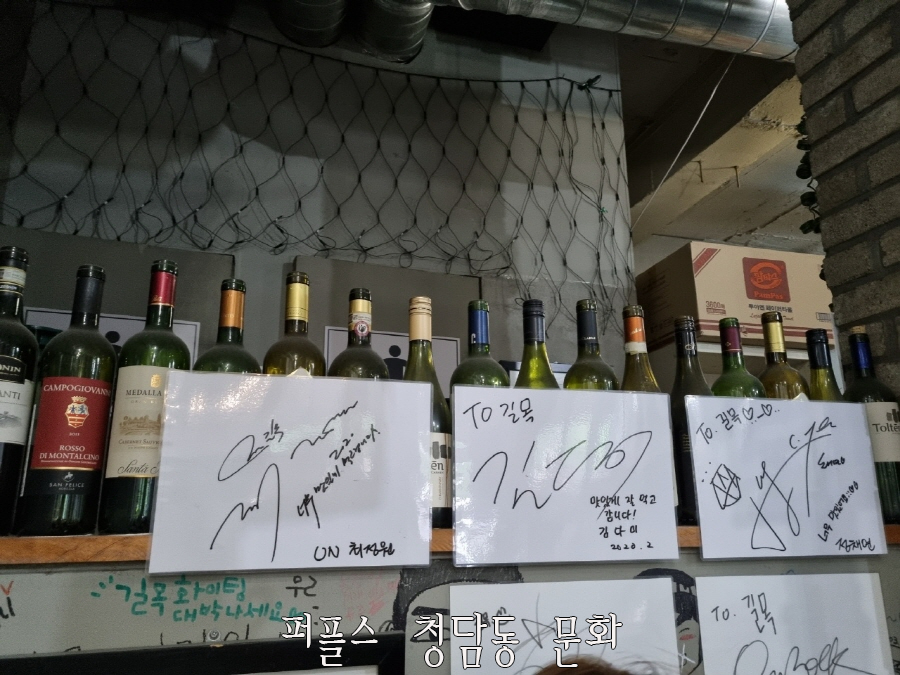 청담동 애프터 데이트 장소로 유명한 <길목>에는 유명 연예인들의 친필 사인이 전시되어 있었는데요. 배우 김다미, 권오중 부터 가수 정채연, 운동선수 모태범 등이 다녀간 곳이라고 합니다.