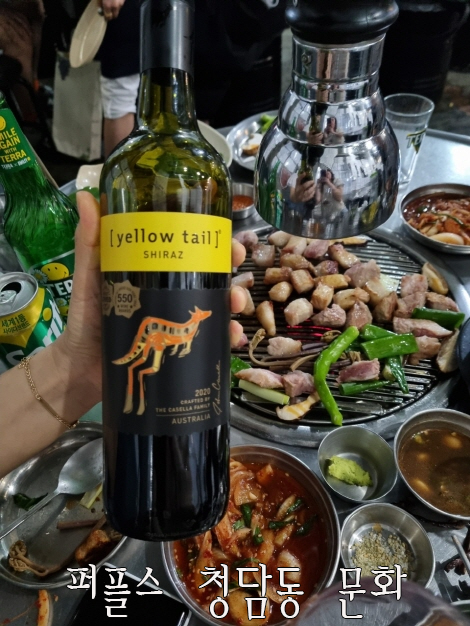 이날 퍼플스 청담동 문화팀은 붉은 육류, 바비큐, 소시지와 어울리는 '옐로우 테일 쉬라즈' 와인을 가져갔는데요. 미국시장에서 최다판매를 보여준 호주와인이며, 이날 목살과 페어링이 아주 좋았습니다. 만일 청담동 애프터 데이트장소로 길목을 방문하신다면 추천드리는 와인은 '1865 리제르바 까르베네 쇼비뇽' , '카멜로드 피노누아', '루이 자도 프티샤블리' 등이 있으니 참고해 주시길 바랍니다.