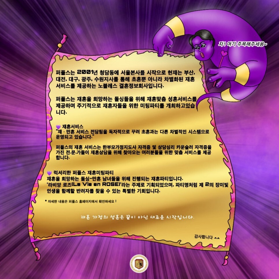 퍼플스 대학생 서포터즈 2조의 웹툰은 '알라딘'을 각색하여 제작한 것으로, 이혼한 알라딘이 퍼플스를 통해 아름다운 자스민 공주를 만나게 되는 스토리인데요. 친근한 인물인 '알라딘'과 '지니'를 등장시켜 유머러스하게 다가왔던 작품입니다.