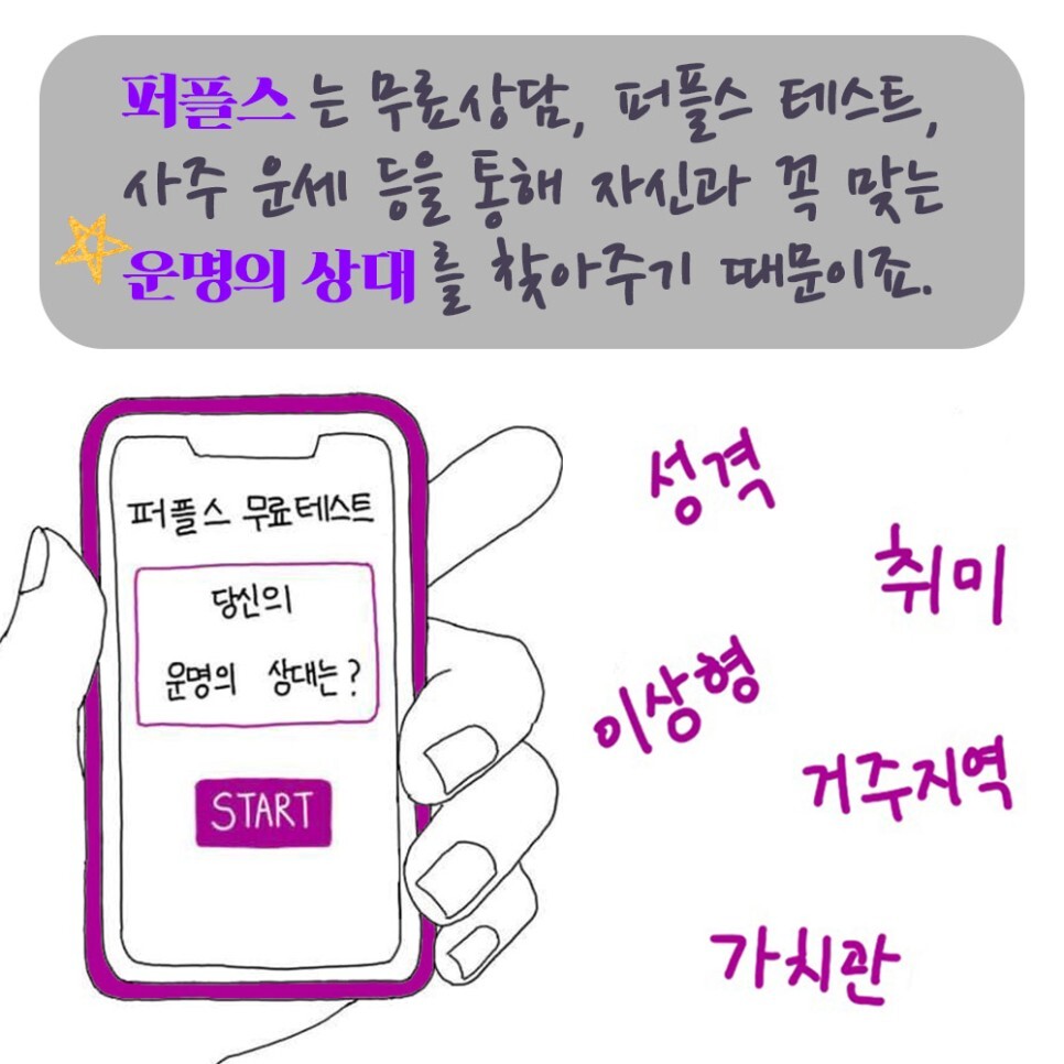 서포터즈 3조 '내 인생의 터닝포인트'는 계속해서 자신의 이상형을 찾지 못했던 주인공이 퍼플스를 통해 동반자를 만나 행복한 결혼을 이루는 내용입니다. 퀄리티 높고 깔끔한 그림체로 결과물을 완성해 준 팀입니다.