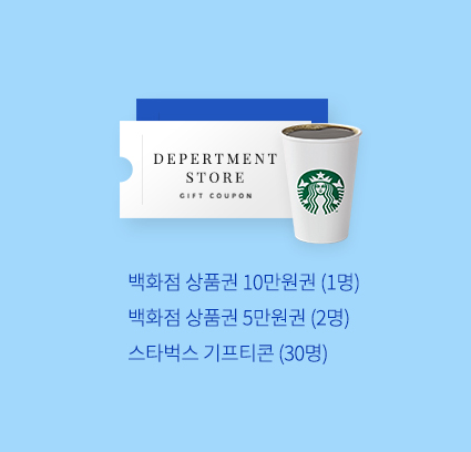 이벤트 상품으로는 백화점 상품권 10만 원(1명)과 백화점 상품권 5만 원(2명) 그리고 스타벅스 기프티콘(30명)이 증정되며 본 이벤트는 남녀노소, 나이 제한 없이 누구나 참여 가능한 이벤트이기에 많은 관심과 참여 바랍니다.