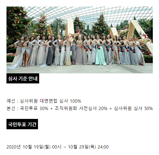 기존 심사위원들 외에도 대한민국 최고의 상류층결혼정보회사 퍼플스 베테랑 커플매니저들이 심사위원으로 참가하여 공정한 심사가 이루어질 예정이며 국민투표 30%, 조직 위원회 사전 심사 20%, 당일 심사위원 심사 50%를 합산하여 수상자를 선발합니다.