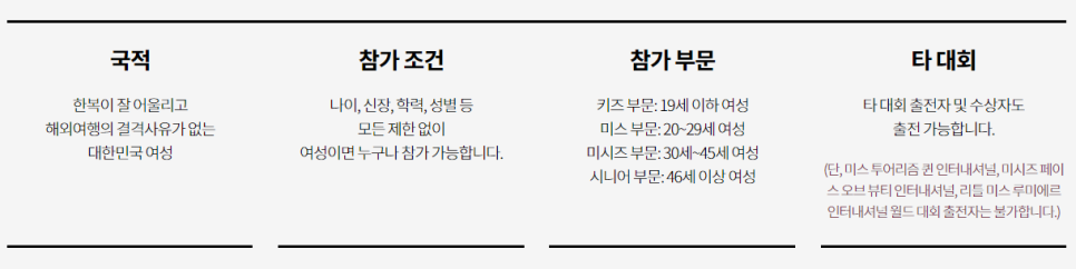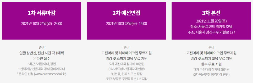 '2021년 10월 24일 일요일' 1차 서류가 마감되며 온라인 신청을 통해 최근 3개월 이내 정면 얼굴 상반신, 전신사진을 각 1매씩 제출해 주시면 됩니다. 2차 예선 면접은 '2021년 10월 28일 목요일 오후 2시'에 진행되며 예선 참가비는 1차 서류심사 합격자에 한해 10만 원에 진행될 예정입니다. 대망의 3차 본선은 '2021년 11월 20일 토요일' 서울 그랜드 워커힐 호텔에서 진행되며, 2차 예선면접 합격자에 한해 참가비 20만 원으로 진행됩니다. 또한, 3차 본선에서는 고전머리 및 헤어 메이크업, 워킹, 스피치 교육 그리고 한복이 무료로 지원됩니다.