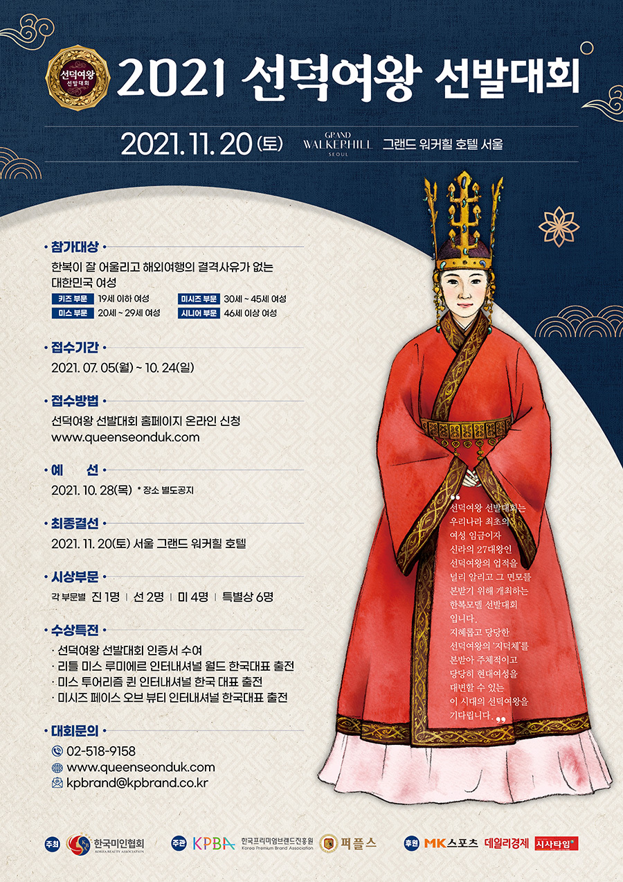 상류층 결혼정보회사 퍼플스가 공식 주관하는 '2021 선덕여왕 선발대회'는 지혜롭고 당당한 선덕여왕의 지덕체를 본받아 주체적인 현대 여성을 대변할 수 있는 이 시대의 선덕여왕을 선발하는 대회입니다. 각 부문의 수상자분들은 한국의 홍보대사로서 현대 여성을 대변하며 세계 미인들의 대제전 월드대회에 대한민국 대표로 출전할 수 있는 영광스러운 기회가 주어집니다.