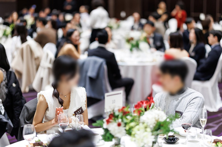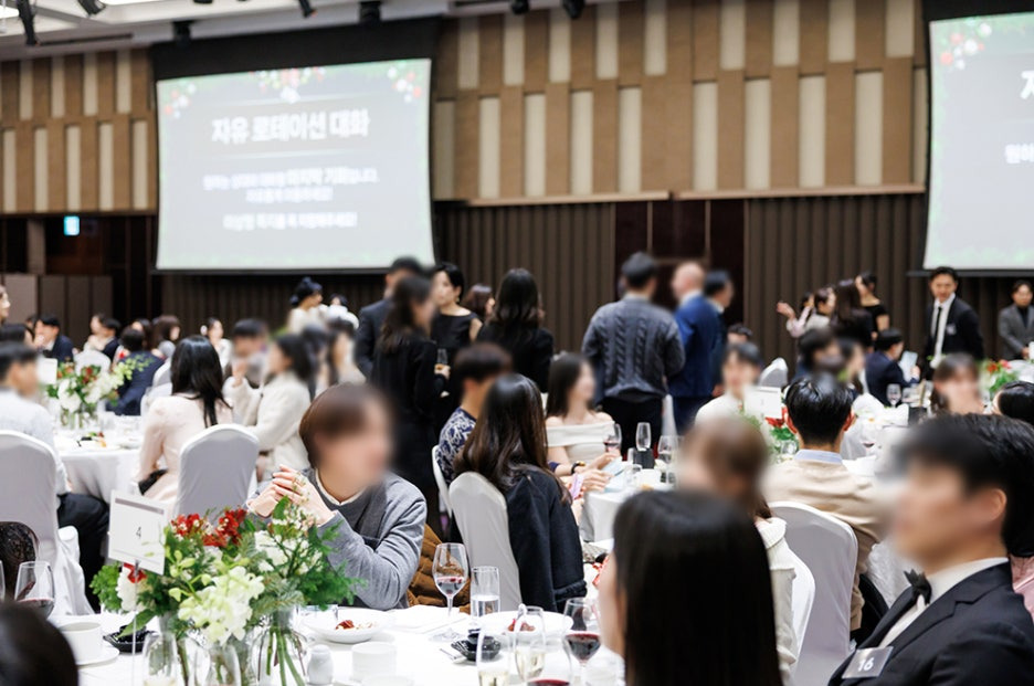 이번 파티에는 남녀 각 100명, 총 200명의 회원님들이 초청되어 보다 폭넓고 균형 있는 만남이 이루어졌는데요. 의료계, 대기업, 전문직, 가업을 잇는 차세대 리더를 비롯해 변호사, 금융계 종사자, 연구원, 교사, 승무원, 방송인 등 다양한 분야에서 활약 중인 남녀 회원님들이 함께했습니다.특정 직업군에 치우치지 않고 다양한 배경과 삶의 방향을 가진 분들이 한자리에 모였다는 점은 퍼플스 연말파티의 가장 큰 특징이자, 퍼플스만의 강점이라 할 수 있습니다.