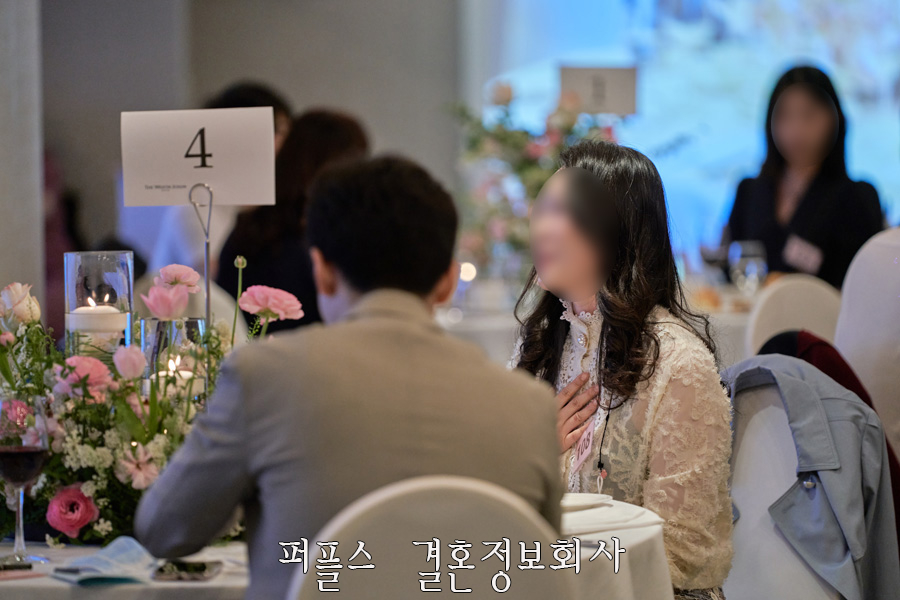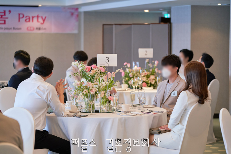 지난 4월 24일, '부산 웨스틴 조선 호텔'에서 퍼플스의 30대 싱글모임 <사랑하고 싶나 봄:Private Party>가 진행되었습니다. 소규모 만남을 주선하기 위해 남녀 각 12명, 총 24명의 회원님들께서 참석해 주셨으며, 코로나 19 이슈에 따라 한 테이블 당 4명의 회원님들이 착석할 수 있도록 하였습니다. 또한, 시원한 통유리창으로 찬란한 해운대 앞바다가 내려다보이는 장소를 선택하여 회원님들의 만족도를 높였습니다.