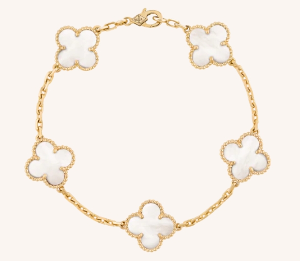 1968년에 첫 선을 보인 반클리프 아펠의 빈티지 알함브라 컬렉션 팔찌입니다. 시대를 초월한 우아한 품격으로 30대 여성들에게 널리 사랑을 받고 있으며 행운을 상징하는 네잎 클로버 형태의 작품 가장자리에는 골드 비즈가 장식되어 있습니다. 5개의 네잎 클로버 모티브는 화이트 마더 오브 펄로 되어 있으며 옐로우 골드 체인으로 이루어져 있습니다.