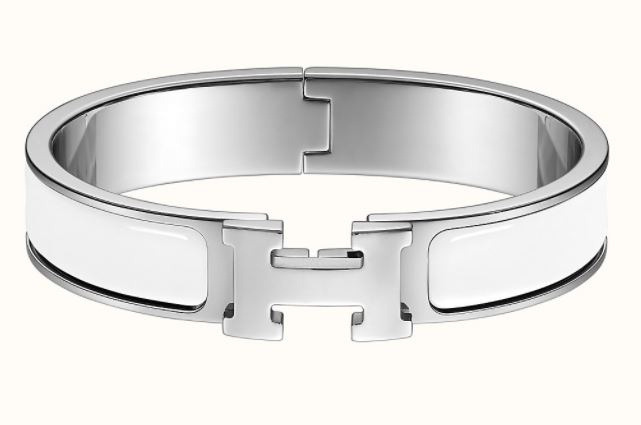 에르메스의 스테디셀러 Clic H 팔찌입니다. 팔라듐 도금 디테일을 더한 에나멜 소재로 되어 있으며 위에 사진에 나와있는 화이트 색상뿐만 아니라 블랙, 핑크, 베이지, 오렌지 등 다양한 색상이 준비되어 있습니다. 정장이나 캐주얼 어느곳에나 매치할 수 있어 오랫동안 30대 여자에게 꾸준한 사랑 받고 있는 아이템입니다.