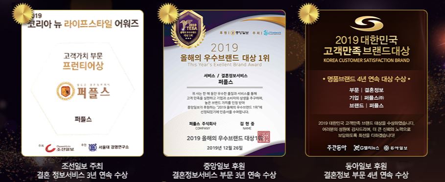 세계적인 명품 브랜드 '비비안 웨스트우드' 와 상류층결혼정보회사 퍼플스와의 공통점을 찾아본다면 브랜드 가치를 입증하는 수상 경력이라는 점입니다. 퍼플스는 대한민국 3대 언론사인 조선, 동아, 중앙에서 진행한 각각의 브랜드 시상식에서 결혼정보업체 유일하여 수상하였으며 2017년 11관왕, 2018년 13관왕, 2019년 10관왕을 기록하였습니다.