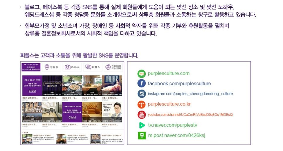 결혼정보회사 퍼플스는 매달 30대 직장인 미혼남녀를 위해 다양한 이벤트, 미팅파티를 진행하고 있습니다. 이뿐만 아니라 고객과의 소통을 위해 페이스북, 인스타그램, 유튜브 등 각종 SNS를 통해 싱글남녀들에게 도움이 되는 맞선 장소 및 노하우, 문화소식을 소개함으로써 상류층 회원들과 소통하는 창구로 활용하고 있습니다. 앞으로도 좋은 정보와 소식 전해드릴 테니 자주 들리셔서 30대 직장인 미혼남녀에게 유용한 정보 가져가시길 바랍니다.