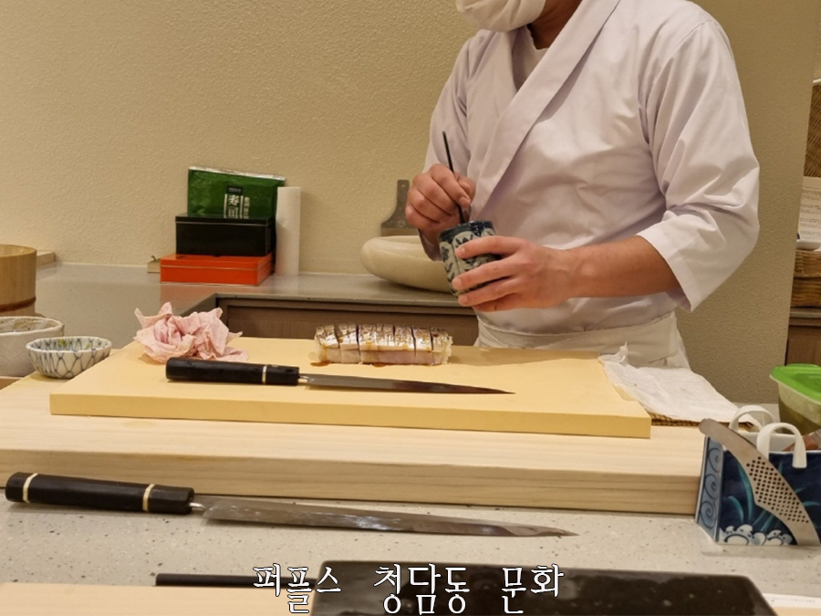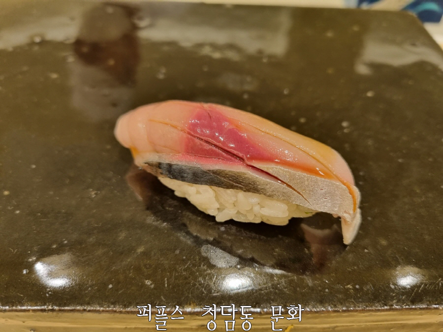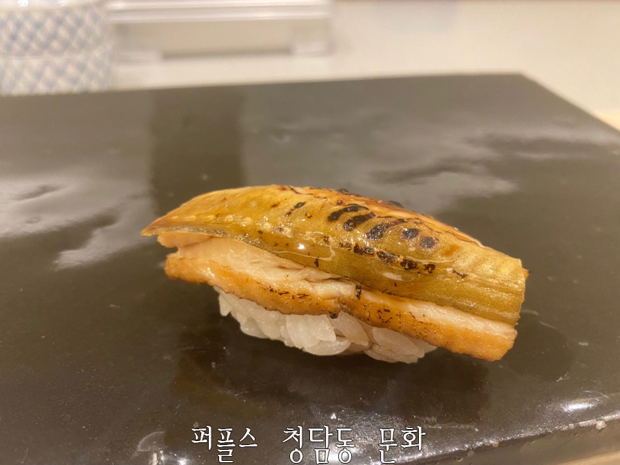 오마카세 맛집 스시사키의 유명한 초절임 고등어는 숙성이 잘 되어 고소하고 달달하며, 생강, 실파, 시소, 백다시마를 올리게 되면 특유의 비린내 없이 맛있게 먹을 수 있습니다.