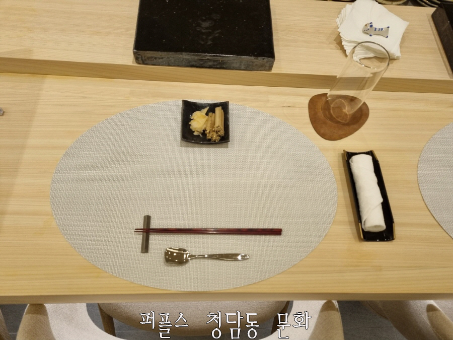가로수길 소개팅 장소에 알맞는 깔끔힘과 심플한 분위기를 나타내며, 기본 테이블 셋팅 후 밑반찬으로 우엉과 생강과, 시원한 녹차와 함께 스시사키만의 특별한 오마카세가 시작됩니다.
