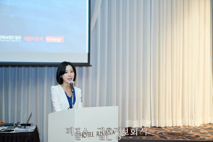 본격적인 시상식이 시작되고 배우이자 MC로 활동하고 있는 김혜원 사회자가 모습을 보였습니다. 김혜원 사회자는 결혼중개업체 퍼플스가 주관한 '선덕여왕 선발대회', '미스글로벌코리아', '미스로얄코리아' 등에서 사회를 맡는 등 퍼플스와 각별한 인연이 있어 더욱 반가운 얼굴이었습니다.