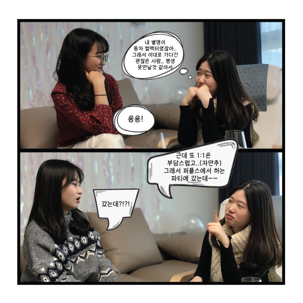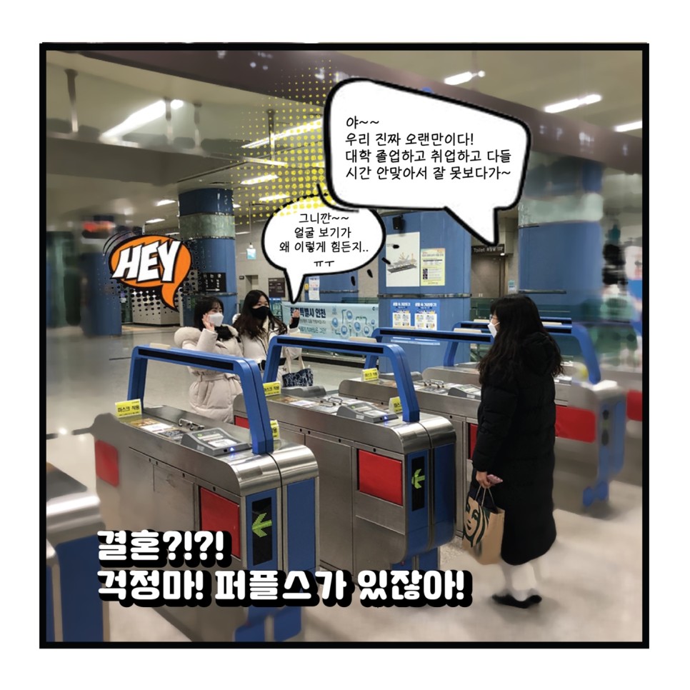 퍼플스 대학생 서포터즈 3조는 '친구에게 결혼정보회사를 추천받는 스토리로, 결혼 적령기 미혼남녀들의 가입'을 유도할 수 있는 홍보 포토튠을 제작하였습니다. 정확한 고객 타겟팅과 그에 맞는 내용을 갖춘 완성도 높은 결과물을 제작하여 전달력과 몰입도를 높였습니다.