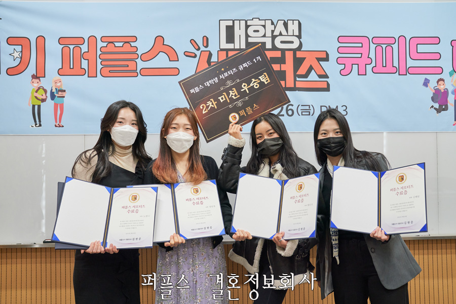 끝으로 대망의 퍼플스 서포터즈 제1기 '최우수 활동팀'은 독특한 콘셉트 도출과 장소 및 의상 선정을 통해 퀄리티 높은 결과물을 제작해 주신 '2조(강소희, 김민지, 손정희, 여이주, 호윤정 님)'가 선정되었습니다. 마지막 미션에서도 역시 퍼플스의 이미지에 맞는 홍보물을 제출해 주셨기에 종합적으로 최우수팀에 선정될 수 있었습니다. 최우수팀에게는 '상금 50만 원'이 제공되었으며 다시 한번 선정되신 모든 분들에게 축하의 인사를 전합니다.