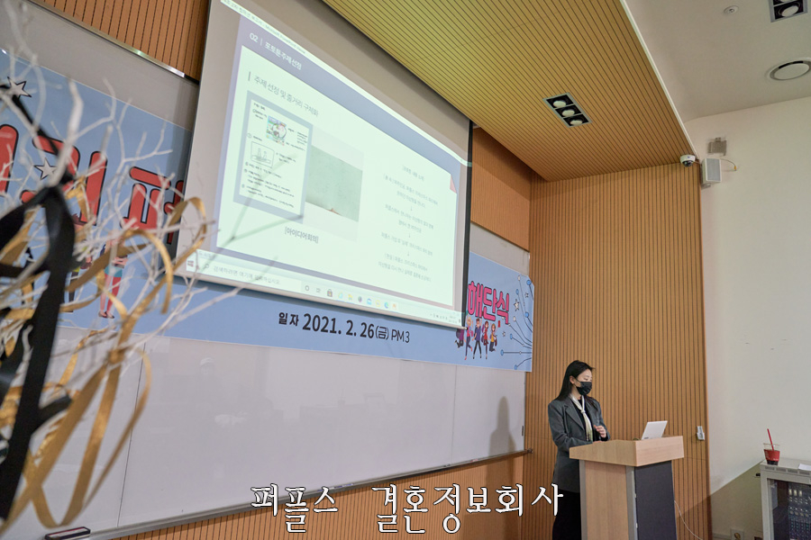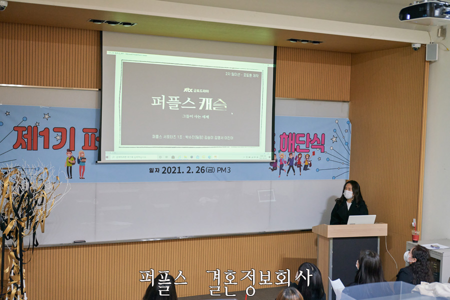다음으로 발표를 준비한 2조는 퍼플스 서포터즈 중 유일하게 '재혼 서비스'를 홍보한 팀이며, '퍼플스의 고품격 재혼서비스를 직관적이고 흥미롭게 표현하기 위해 춘향전을 재해석한 포토튠'을 제작하였습니다. 콘셉트에 맞는 장소 선정과 의상 선택을 통해 완성도 높은 홍보물을 도출해 냈으며, 팀원과의 화합이 돋보였습니다.
