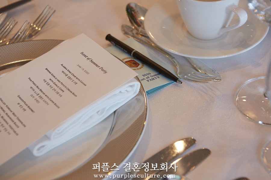 지난 6월 13일 '웨스틴 조선호텔 부산'에서 퍼플스의 <Scent of Summer Party> 미팅파티가 진행되었습니다. 더욱 프라이빗한 만남을 위해 24명의 회원들만이 참석하여 파티를 즐겨주셨는데요. 파티장은 화려한 색감의 센터피스를 사용하여 여름의 분위기를 더욱 살렸으며 전면 통유리창을 통해 해운대 바다가 펼쳐져 회원들의 만족도가 매우 높은 장소였습니다.