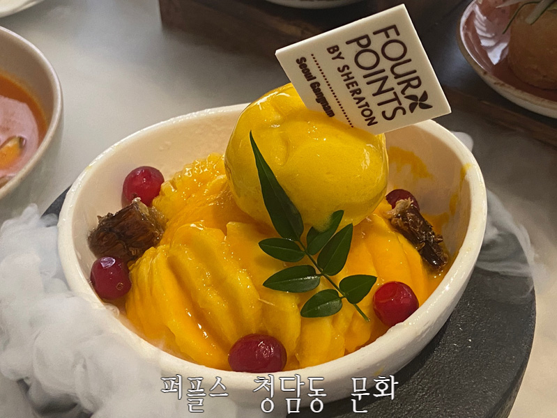 신사동 데이트 코스 '포포인츠'에서 청담동 문화팀은 '망고 애프터눈티 세트'와 '망고 빙수'를 선택하였으며, 웰컴 드링크인 '망고주스'는 셔벗 형태로 시원하고 달콤한 식감을 자랑하였습니다.