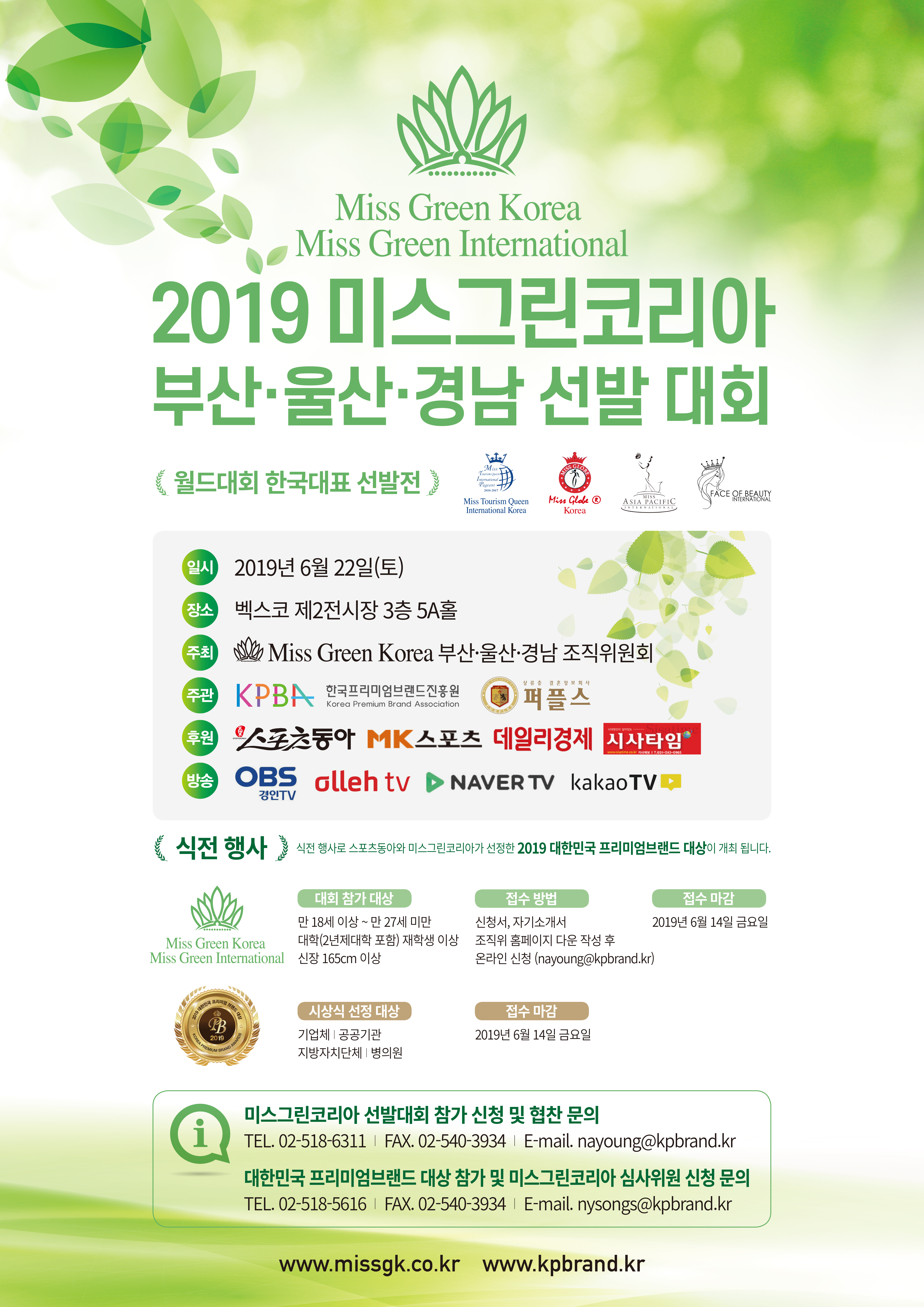미스그린코리아는 스포츠동아와 MK 스포츠, 데일리경제, 시사 타임 후원하고 한국프리미엄브랜드진흥원과 아나운서 결혼 성사시키는 결혼정보업체 퍼플스가 공동 주관하는 국내 최고의 미인대회로서, 친환경 홍보와 더불어 사회 부조리와 모순에 대처하고 깨끗한 세상 만들기에 앞장서서 사회 공익성에 기여하는 취지와 목적으로 2011년부터 개최해 온 대회입니다.