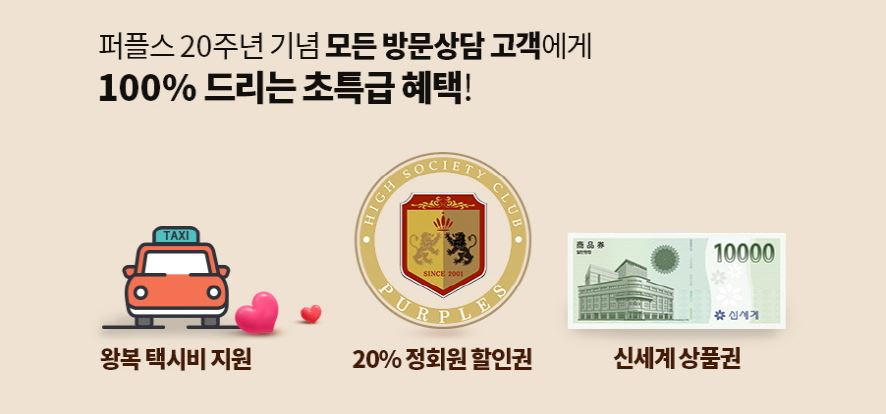 먼저 고객님들이 가장 좋아하실 만한 혜택을 준비했습니다, 바로 왕복 택시비 지원인데요. 요즘에 코로나19로 인해 대중교통 이용도 부담스럽고 혹여나 자택과 압구정결혼정보회사 퍼플스 상담센터와의 거리가 있으신 분들은 선뜻 상담을 받으러 오기 힘드실 텐데요. 그리하여, 퍼플스에서는 왕복 택시비를 지원하기로 했습니다. 또한, 연휴기간에만 드리는 20% 정회원 할인권과 신세계상품권이 증정됩니다.