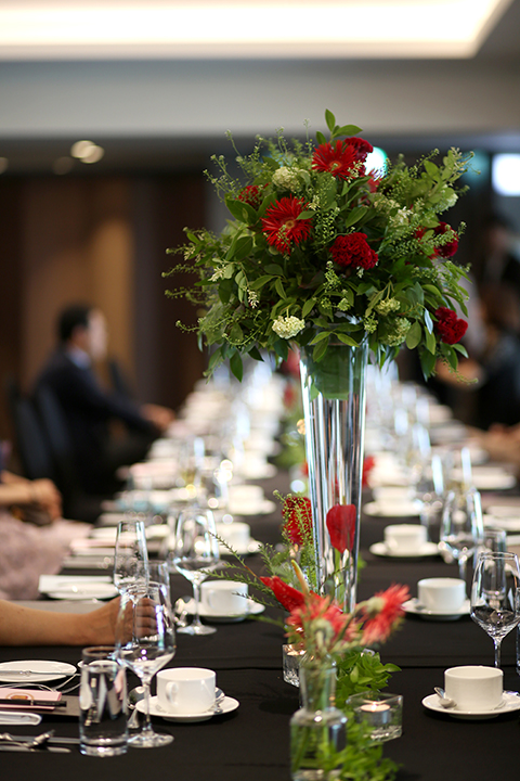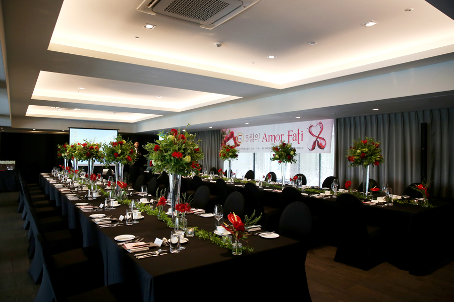 오늘의 운명적 만남이 이뤄질 파티장입니다. 지난번과 마찬가지로 일자 테이블에 센터피스로 화려함을 더했는데요. 특히, 이번 파티에는 <Amor Fati> 콘셉트에 맞게 강렬한 레드로 포인트를 주어 더욱 생기 있는 파티 분위기를 만들려고 노력을 하였습니다.