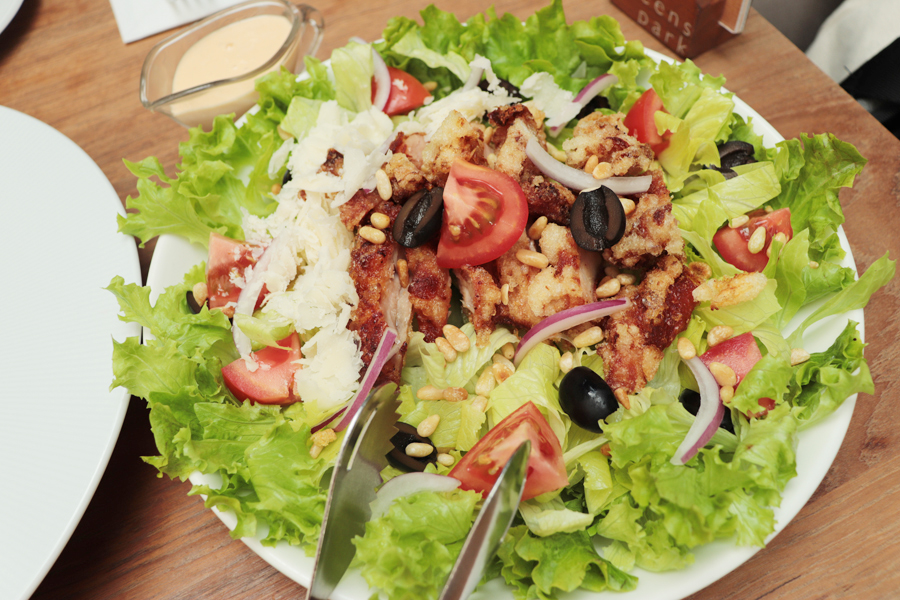 정직한 농가로부터 공급받은 신선한 로메인에 퀸즈파크만의 특제 시저 드레싱을 더한 샐러드입니다.