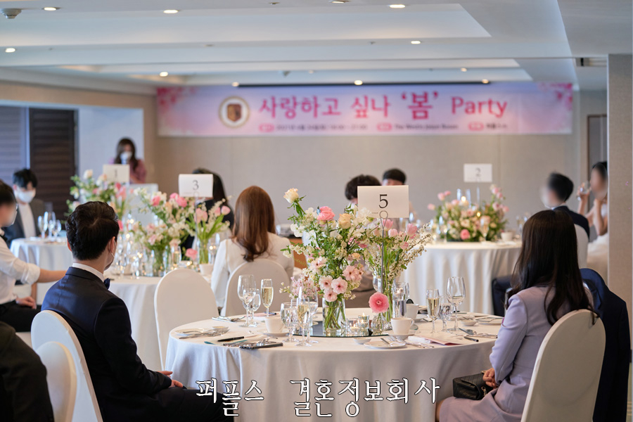 지난 4월 24일, '부산 웨스틴 조선 호텔'에서 퍼플스의 30대 싱글모임 <사랑하고 싶나 봄:Private Party>가 진행되었습니다. 소규모 만남을 주선하기 위해 남녀 각 12명, 총 24명의 회원님들께서 참석해 주셨으며, 코로나 19 이슈에 따라 한 테이블 당 4명의 회원님들이 착석할 수 있도록 하였습니다. 또한, 시원한 통유리창으로 찬란한 해운대 앞바다가 내려다보이는 장소를 선택하여 회원님들의 만족도를 높였습니다.