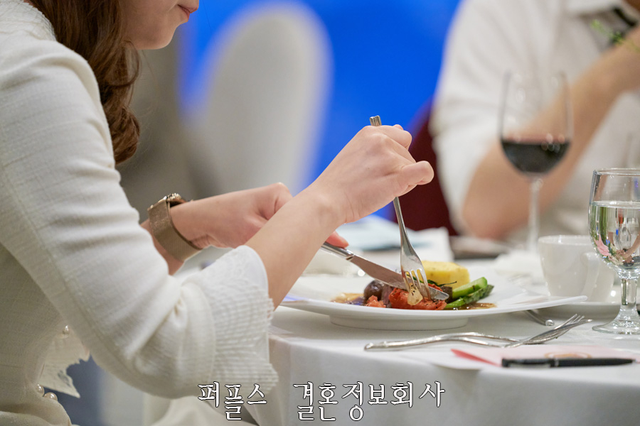 멋진 팝페라 무대 이후 부산 웨스틴 조선호텔 만의 최고급 코스요리가 준비되었습니다. 화기애애한 분위기 속에서 식사가 진행되었으며, 마주 앉은 이성과 가벼운 대화를 나누는 모습을 보여주기도 하였는데요. 어느덧 서로에 대한 경계심과 긴장감이 완화되는 모습을 보이며 파티에 참석한 모든 분들이 함께 즐겨주고 계셨습니다.