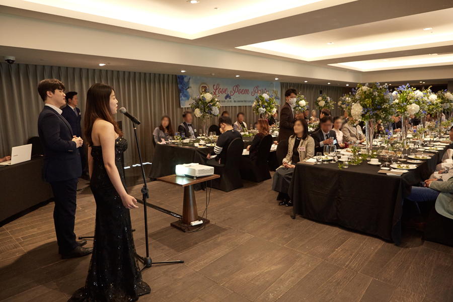 식사가 끝나갈 때쯤 소프라노 박누리와 테너 동우진의 팝페라 공연이 이어졌으며 오늘의 파티 분위기에 맞는 로맨틱한 노래가 시작되었습니다. 대화를 나누시던 회원님들도 모두 집중하는 모습을 보여주시며 잠시 리프레쉬 하는 시간을 가졌습니다.